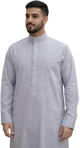 يتميز هذا الثوب الرمادي للرجال بتصميم خالد وأنيق، مثالي للارتداء اليومي والصلاة والمناسبات الخاصة. تم تصميمه مع الاهتمام بالتفاصيل، ويأتي مع فتحة زر أمامية نظيفة وياقة منظمة تضيف مظهرًا راقيًا.