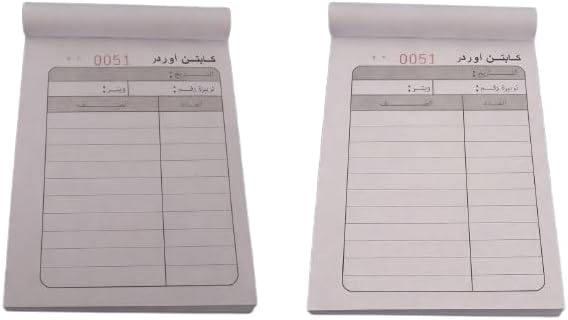 يقوم ورق النسخ الكربوني (المكون من جزأين) بإنشاء نسخة مكررة فورية لسهولة حفظ السجلات. صفحات مرقمة مسبقًا لتتبع الطلبات وتنظيمها بشكل أفضل. تحتوي على 50 ورقة بتصميم واضح ومنظم بشكل جيد. يتضمن التصميم العملي أقسامًا لرقم الطلب والتاريخ ورقم الجدول ووصف العنصر والكمية. يضمن الورق الناعم وعالي الجودة كتابة نظيفة دون تلطيخ الحبر.