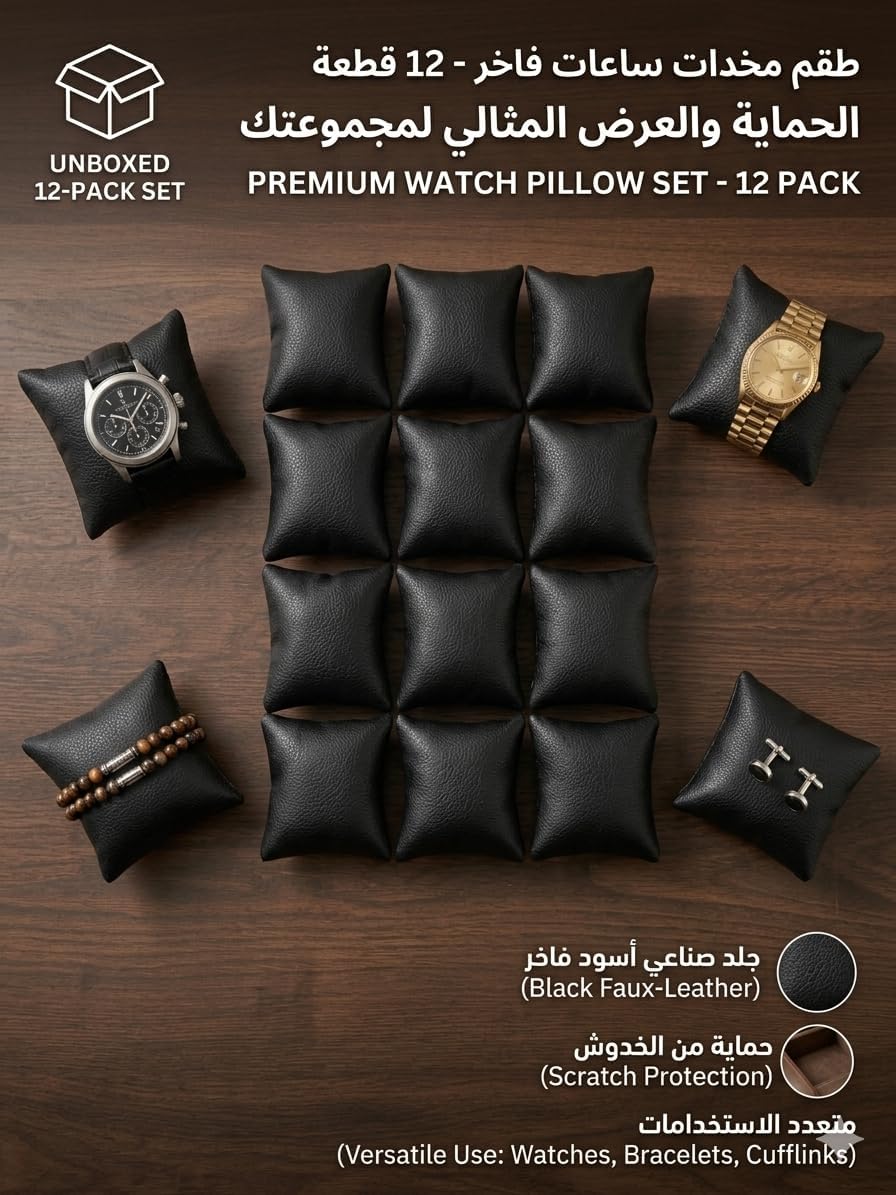 مجموعة كاملة مكونة من 12 قطعة: تشتمل كل عبوة على 12 وسادة ساعة متميزة، مما يوفر حلاً احترافيًا وبأسعار معقولة للمجموعات الكبيرة أو شاشات واجهة متجر البيع بالتجزئة. حماية فائقة: مصنوعة من جلد صناعي ناعم وعالي الجودة يمنع الخدوش والجروح والأضرار التي تلحق بواجهات ساعتك وأساورك وأساورك. عرض أنيق: يوفر اللون الأسود الكلاسيكي خلفية متطورة تجعل ساعاتك وأساورك وأساورك الفاخرة مميزة. ملاءمة عالمية: مصممة بهيكل مرن ليناسب معظم أحجام وأنماط الساعات. مثالي للاستخدام في لفافات الساعات أو صناديق المجوهرات أو إدخالات الأدراج المخصصة. استخدام متعدد الاستخدامات: ليس فقط للساعات! تعتبر هذه الوسائد مثالية لعرض الأساور، وأساور الكاحل، وأزرار الأكمام، وغيرها من قطع المجوهرات الفاخرة. وصف المنتج قم بترقية مجموعتك من خلال العرض التقديمي الاحترافي سواء كنت من عشاق صناعة الساعات الجادين أو صاحب متجر بيع بالتجزئة، فقد تم تصميم مجموعة وسائد الساعات الفاخرة MySouqEg للحفاظ على ساعاتك في حالة ممتازة. تم تصميم كل وسادة للحفاظ على شكل أحزمة ساعتك —سواء كانت جلدية أو معدنية أو سيليكون— لمنع التجاعيد أو التوتر غير المرغوب فيه. الميزات الرئيسية: المادة: جلد بولي يوريثان أسود متين (سهل التنظيف بالمسح). الشكل: وسادة ذات محيط ناعم لملاءمة مريحة. الكمية: 12 وسادة فردية. الأبعاد: الحجم القياسي متوافق مع معظم منظمات الساعات التجارية. التنظيم والحماية والعرض قل وداعًا للأدراج المزدحمة. تسمح لك هذه الوسائد بتنظيم إكسسواراتك بدقة، مما يجعل من السهل اختيار القطعة المفضلة لديك لهذا اليوم. مثالي للتنظيم المنزلي أو التصوير الفوتوغرافي الاحترافي لقوائم التجارة الإلكترونية.