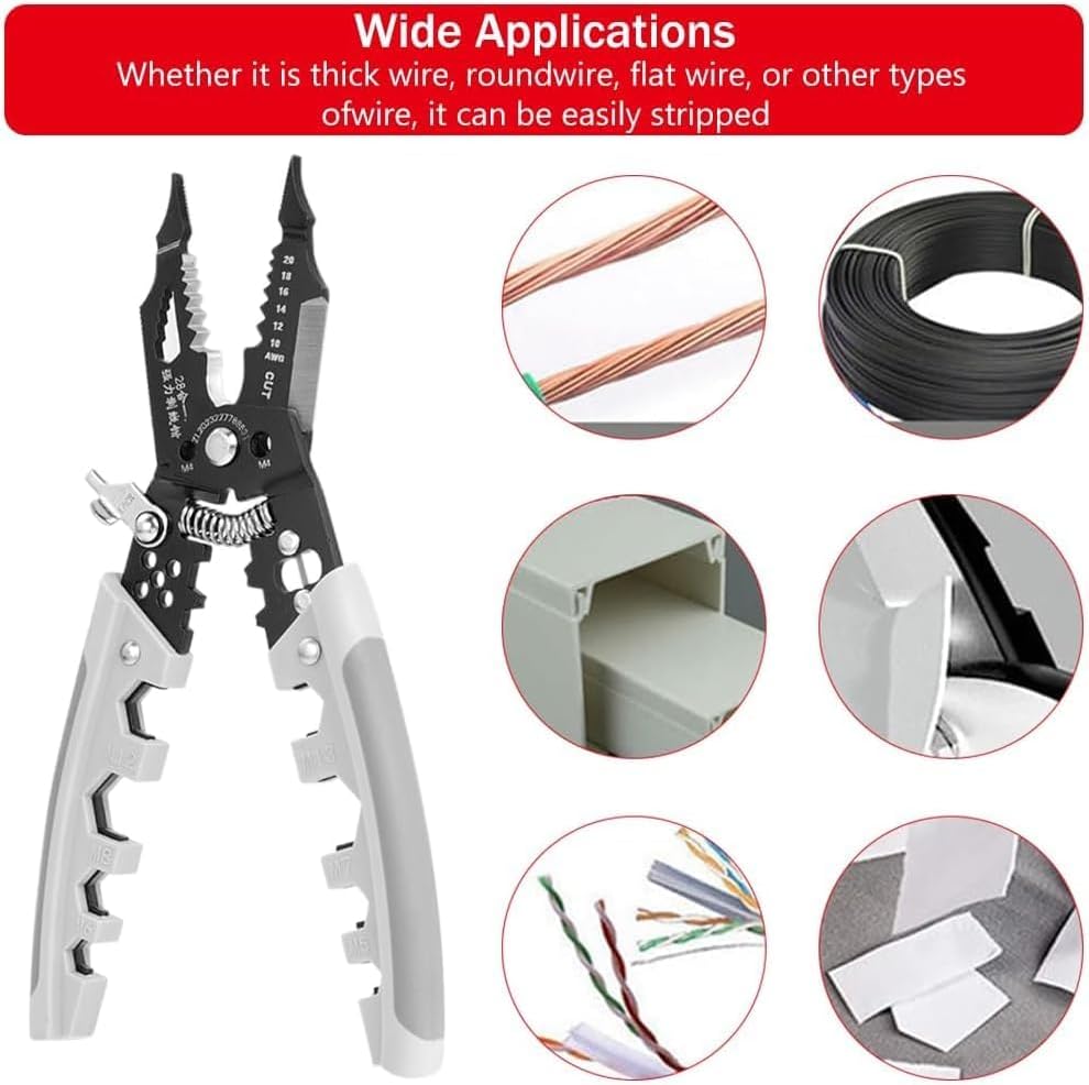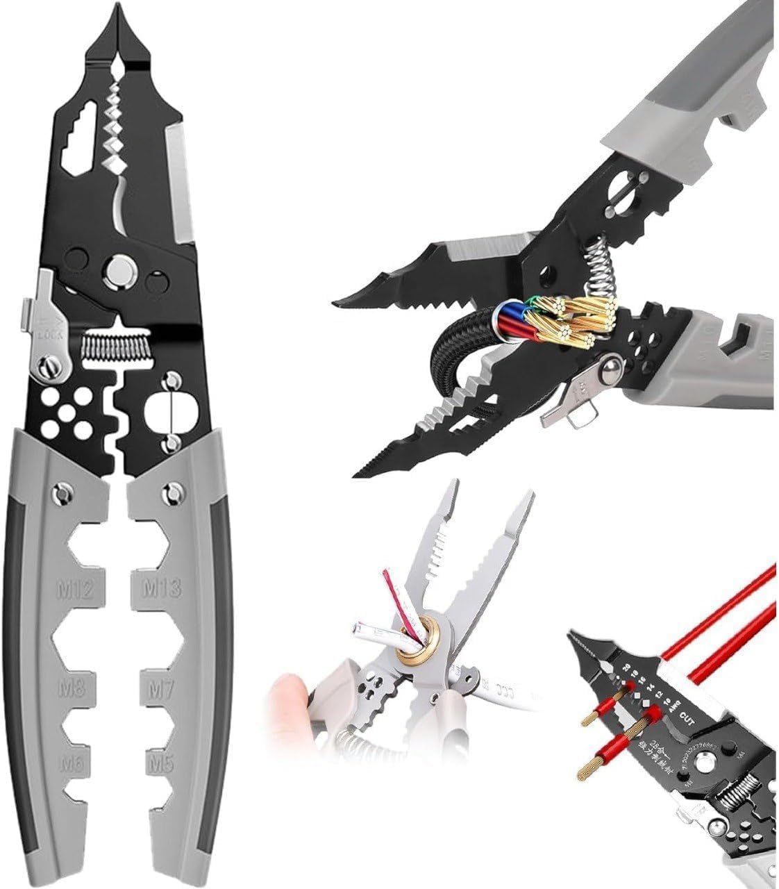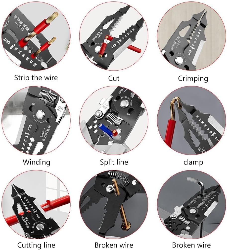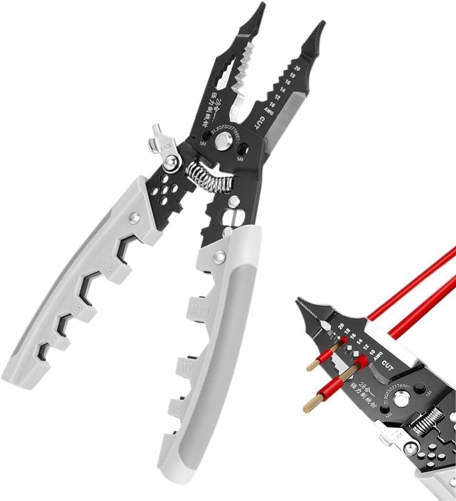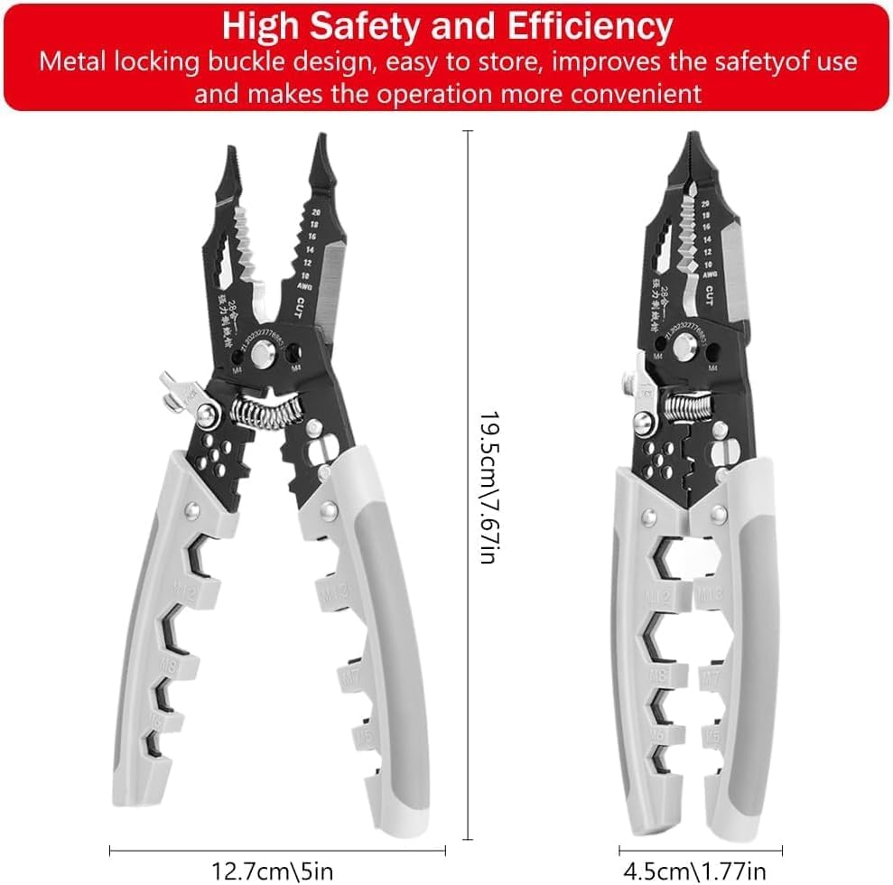 تصميم متعدد الأدوات 7 في 1: أداة كهربائية متعددة الاستخدامات تجمع بين تجريد الأسلاك وقطعها وتجعيدها والإمساك بها وتعمل كقاطع/مفتاح ربط (مفتاح ربط) في كماشة واحدة. تجريد عالي الدقة: يتميز بفتحات قياس سلكية محددة بوضوح على الفك لتجريد دقيق للأسلاك الصلبة والمجدولة، تغطي عادةً $10$ إلى $20 ext{ AWG}$ (كما هو موضح في الأداة).هيكل متين: مصنوع من سبائك الفولاذ المقسى (أو الفولاذ عالي الكربون) للحصول على قوة ومتانة فائقة، مما يضمن حافة قطع حادة وقوة إمساك موثوقة. قبضة مريحة غير قابلة للانزلاق: توفر المقابض المريحة مع إدخالات بلاستيكية/مطاطية قبضة آمنة ومريحة وغير قابلة للانزلاق، مما يقلل من إجهاد اليد أثناء الاستخدام لفترة طويلة. تتميز المقابض أيضًا بفتحات إمساك مدمجة بالصامولة/المسمار (وظيفة المفتاح).حركة محملة بنابض: تتضمن آلية زنبركية مركزية لفتح وإغلاق سهل وسريع وسلس، مما يعزز السرعة والكفاءة أثناء المهام المتكررة. الحجم المثالي: بسعر 19 دولارًا تقريبًا ext{cm}$ (7.5 دولارًا ext{inch}$)، توفر هذه الأداة رافعة ممتازة وتناسب تمامًا أي صندوق أدوات قياسي أو حزام أدوات. وصف المنتج أداة الكهربائي الأساسية – القطع والتجعيد، و نزعها بكماشة واحدة!توقف عن التلاعب بأدوات متعددة! إن أداة تجريد وتجعيد الأسلاك متعددة الوظائف ذات الجودة الاحترافية هذه هي الأداة الوحيدة التي ستحتاجها لمعظم أعمال التركيب والإصلاح الكهربائية. يبلغ طوله $19 ext{cm}$، وهو يوفر التوازن المثالي بين الرافعة المالية والدقة.🔌 وظيفة الكل في واحد: تحل هذه الأداة القوية محل الكماشات القياسية وقواطع الأسلاك والمجعدات وحتى المفاتيح الصغيرة! تسمح الفكين المصممة خصيصًا بتجريد الأسلاك بشكل نظيف دون إتلاف الموصل، بينما تقطع الشفرات المتصلبة أسلاك النحاس والألومنيوم بسهولة. استخدم الفتحات المدمجة الموجودة على المقابض لتدوير البراغي والصواميل، مما يوفر لك الوقت والمساحة في مجموعتك. تم تصميمه ليدوم طويلاً ومصمم لتحقيق الكفاءة، وهو الموفر النهائي للوقت لعشاق الأعمال اليدوية والتجار المحترفين على حدٍ سواء